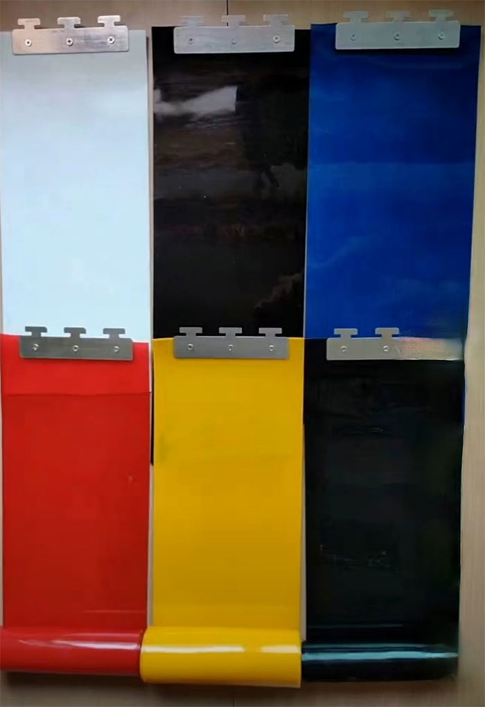 簾片寬度20m m ,*30 m m,簾片厚度1.0mm,2.0mm,3.0mm也可以根據(jù)客戶要求訂做尺寸,場地高寬尺寸不限。簾片上方用不銹鋼夾片與龍骨連接,方便拆卸更換,便于人及車輛貨物通過。